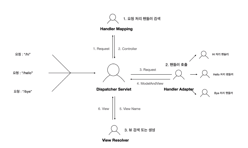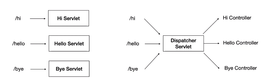 - 여러 요청에 따라 각각 서블릿은 비효율적 - 관리: 멀티 쓰레드 조심해야 함 - 개발: Handler 공통 로직 중복 - Dispatcher Servlet: 전면에 하나의 서블릿 두고 모든 처리를 다 받자!