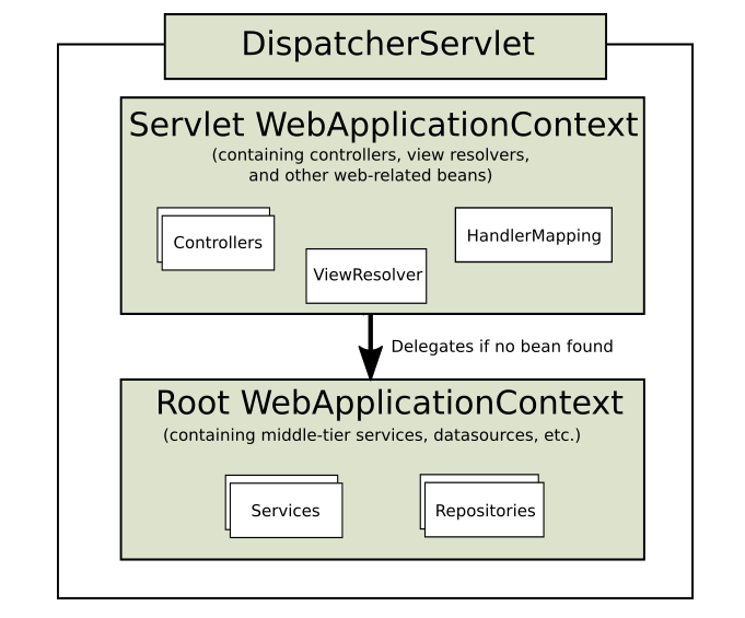 - Servlet WebApplicationContext - Containing controllers, view resolvers, and other web-related beans - 주로 각각의 Servlet에서 사용하는 View 자원을 구성할 때 - DispatcherServlet에 의해 생성되는 자식 WebApplicationContext - 이게 자식이야(controller) - 따라서 부모 참조 가능(service/dao)