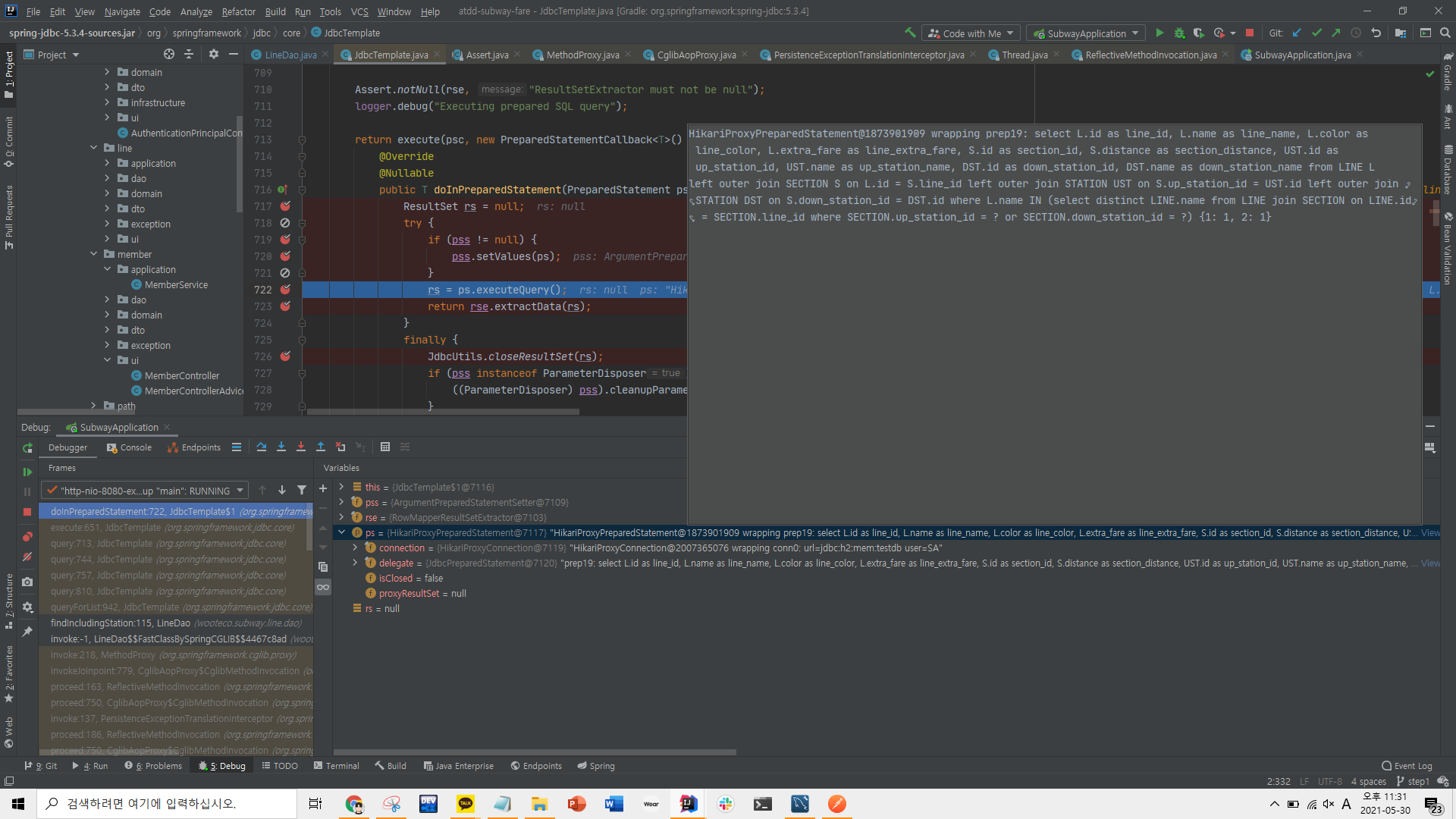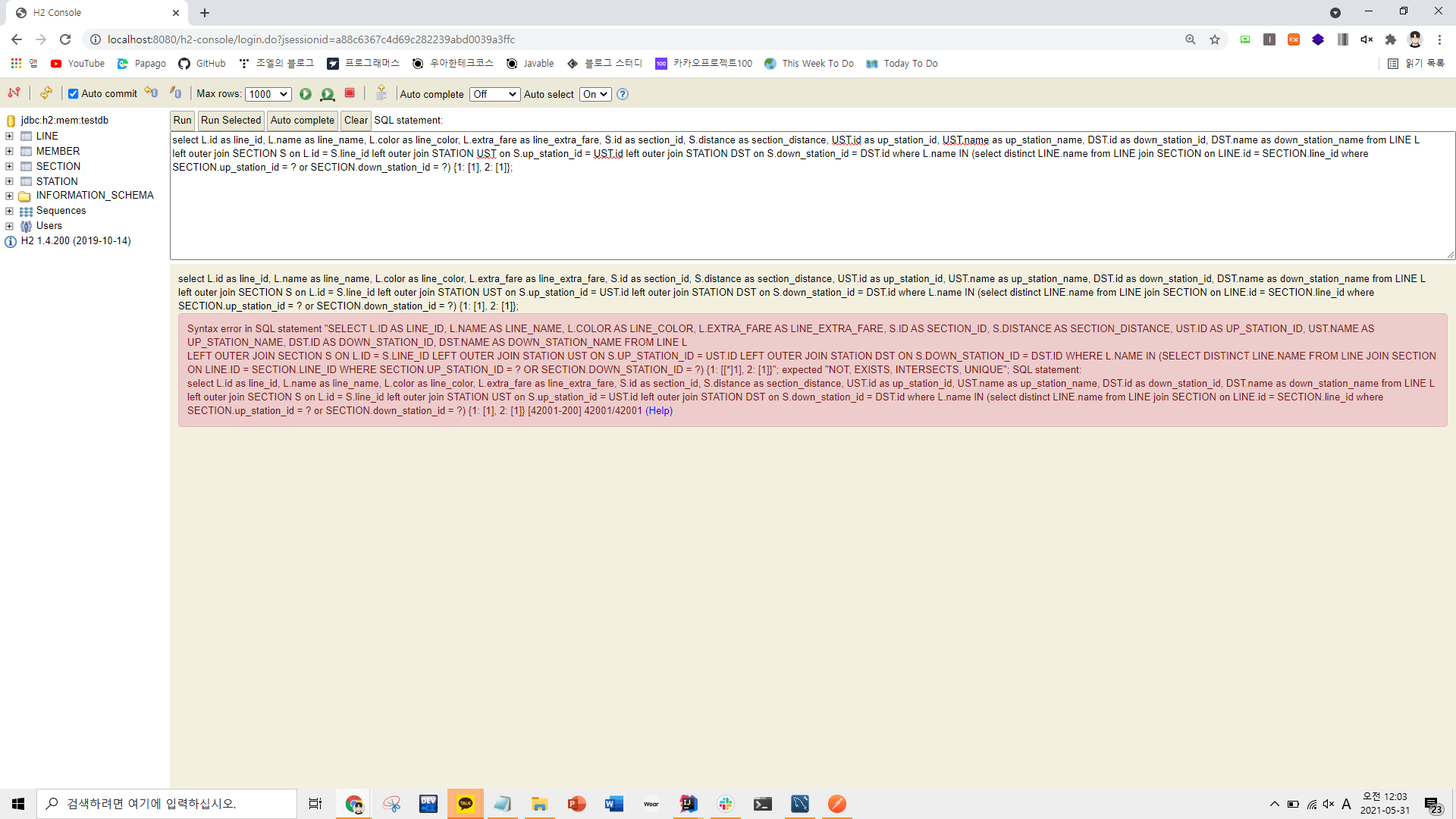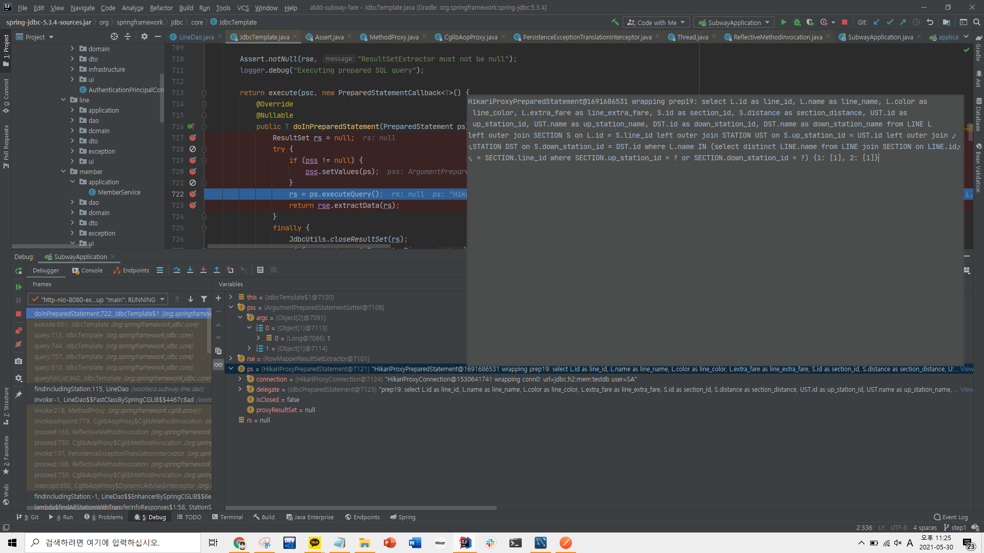 public List<Line> findIncludingStation(Long stationId) { String sql = "select L.id as line_id, L.name as line_name, L.color as line_color, L.extra_fare as line_extra_fare, " + "S.id as section_id, S.distance as section_distance, " + "UST.id as up_station_id, UST.name as up_station_name, " + "DST.id as down_station_id, DST.name as down_station_name " + "from LINE L \n" + "left outer join SECTION S on L.id = S.line_id " + "left outer join STATION UST on S.up_station_id = UST.id " + "left outer join STATION DST on S.down_station_id = DST.id " + "where L.name IN (select distinct LINE.name " + "from LINE join SECTION on LINE.id = SECTION.line_id " + "where SECTION.up_station_id = ? or SECTION.down_station_id = ?)"; List<Map<String, Object>> result = jdbcTemplate.queryForList(sql, new Object[]{stationId, stationId}); return mapLines(result); //OR! List<Map<String, Object>> result = jdbcTemplate.queryForList(sql, stationId, stationId); return mapLines(result); }- 이제 queryForList()의 Object...에 넘겨줄 인자가 [stationId, stationId] 로 스무스해진 것을 알 수 있어 - 이게 곧 다음과 같은 쿼리를 H2에서 날리게 해줘 -