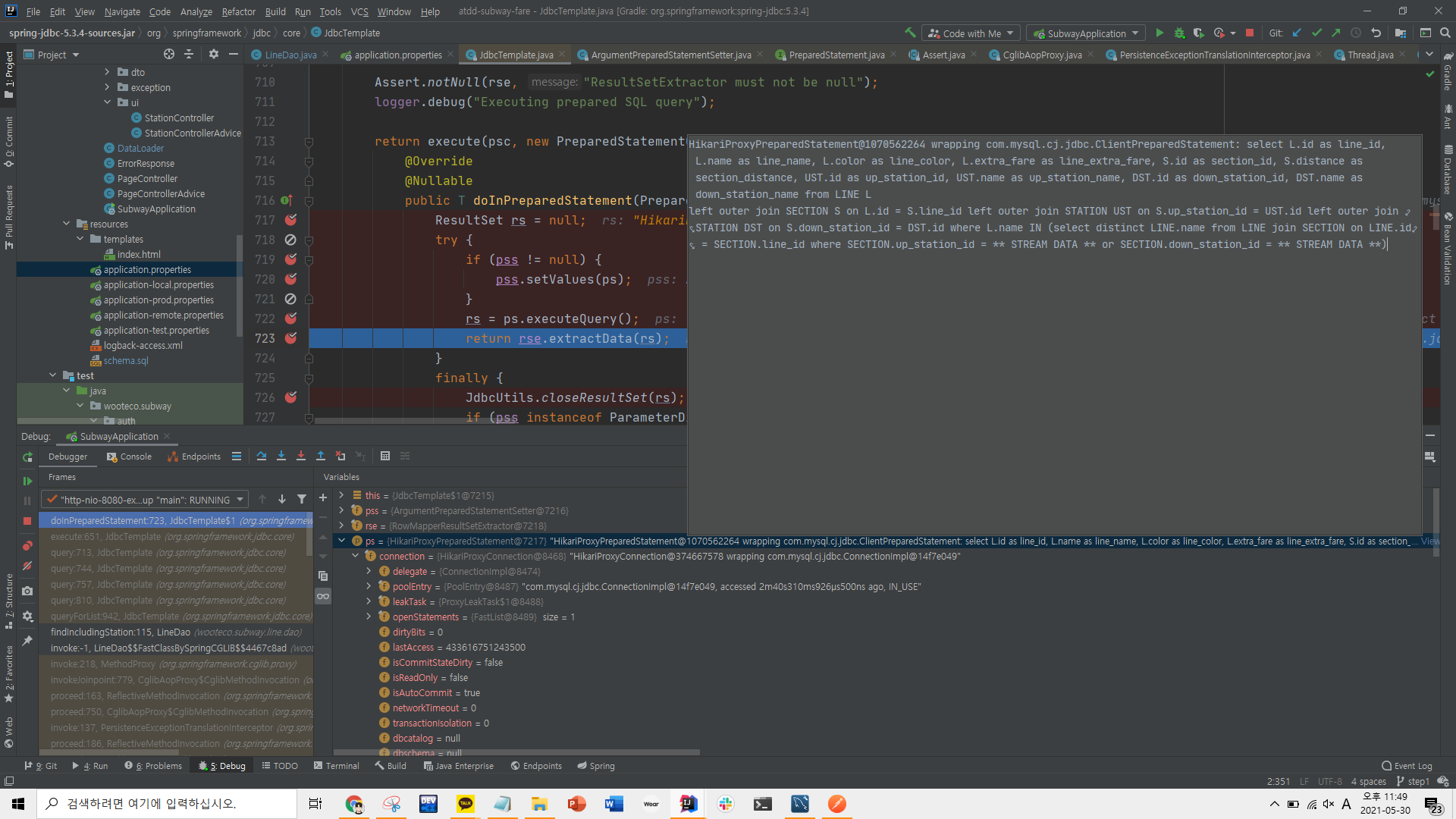 public List<Line> findIncludingStation(Long stationId) { String sql = "select L.id as line_id, L.name as line_name, L.color as line_color, L.extra_fare as line_extra_fare, " + "S.id as section_id, S.distance as section_distance, " + "UST.id as up_station_id, UST.name as up_station_name, " + "DST.id as down_station_id, DST.name as down_station_name " + "from LINE L \n" + "left outer join SECTION S on L.id = S.line_id " + "left outer join STATION UST on S.up_station_id = UST.id " + "left outer join STATION DST on S.down_station_id = DST.id " + "where L.name IN (select distinct LINE.name " + "from LINE join SECTION on LINE.id = SECTION.line_id " + "where SECTION.up_station_id = ? or SECTION.down_station_id = ?)"; List<Map<String, Object>> result = jdbcTemplate.queryForList(sql, new Object[]{stationId}, new Object[]{stationId}); return mapLines(result); }- 다음과 같이 코드를 작성해놓고, H2로 돌아가는 스프링 부트 테스트 코드 다 통과 시키고 룰루랄라 서버에 배포 - 근데 서버에서 계속 해당 jdbcTemplate.queryForList()의 결과를 "[]" 빈 List로 반환함 - 어라...? H2에서는 이게 하나도 안터지던 테스트였는데? - 어라? H2를 기본으로 하고 로컬에서 서버 키고 PostMan으로 보내보면 결과 잘 반환하는데? - 근데 서버에 올려서 mysql로 하면 안된다? 왜..지??