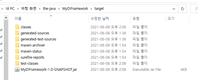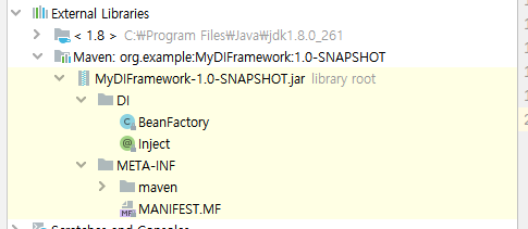 <dependencies> <dependency> <groupId>org.example</groupId> <artifactId>MyDIFramework</artifactId> <version>1.0-SNAPSHOT</version> </dependency> </dependencies>- 이렇게 외부 라이브러리로 나의 코드가 주입된 것을 알 수 있다