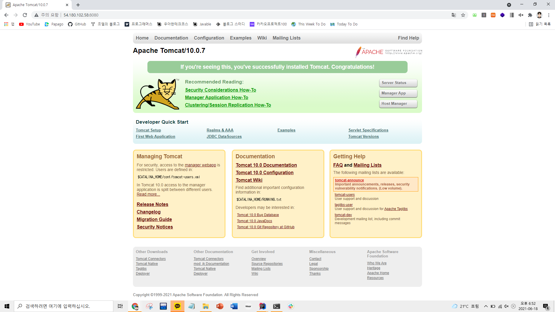 Tomcat 실행/종료 해보기 - apache-tomcat-10.0.7/bin의 startup.sh 로 톰캣 실행 - 기본적으로 8080 포트에 잡혀있음 - http://EC2-public-ip:8080 로 들어가면 톰캣 웰컴 페이지 나옴