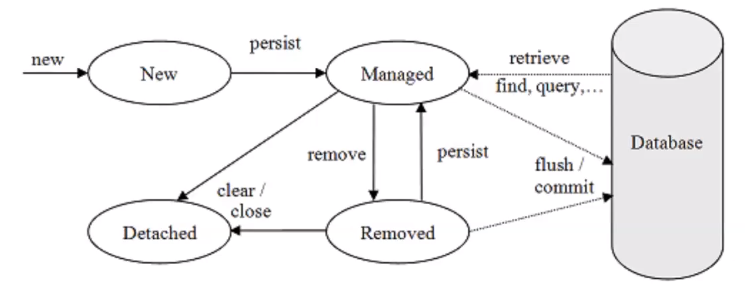- 비영속: 방금 인스턴스 생성한거 (메모리엔 있는데 DB/영속성 컨텍스트는 모름)