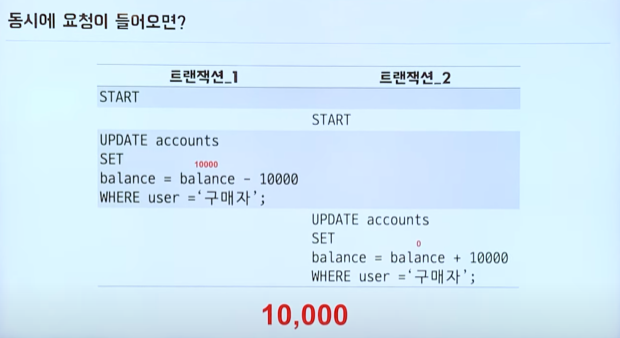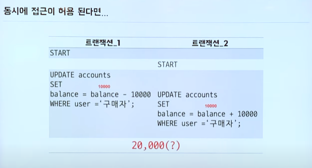 - DB에서의 트랜잭션 - Transaction: 더 이상 나눌수 없는 가장 작은 하나의 단위 - 하나의 명령 실행시, DB가 온전히 그 명령을 실행해 주는 것 - 사용자가 데이터베이스에 대한 완전성을 신뢰할 수 있도록 - DB에서는 기본적으로 트랜잭션 관리 위한 설정이 있어 - 명령 끝마칠때 까지 수행내역을 로그로 저장해둬 - Redo Log - Undo Log - 여러 명령을 하나의 트랜잭션으로 묶고 싶다면? - 트랜잭션의 성질 - 원자성: 성공하면 싹다, 아니면 다 돌려! (롤백/커밋) - 일관성: DB 상태, DB 계층관계, 칼럼 속성 등 항상 일관되게 유지하는 것 - 지속성: 영원히 DB에 내용이 저장되어야해 - 독립성: 딴거 끼어들 수 없어! - 트랜잭션은 격리 수준 설정을 통한 독립성을 보장해! - DB에 작업 요청들어오고, 모든 작업 독립성 보장해 하나씩 순차진행하면, CPU는 응답 대기 시간 너무 길어져
