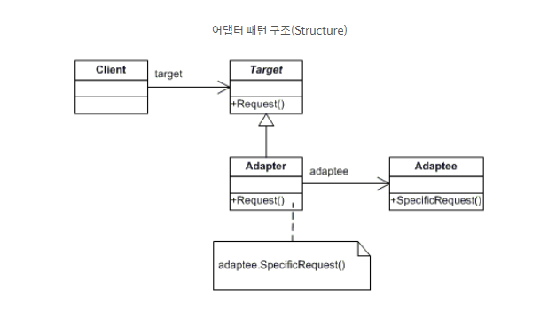 - 특징 - 한 클래스의 인터페이스를 사용하고자 하는 다른 인터페이스로 변환할 때 주로 사용 - 인터페이스 호환성이 맞지 않아 같이 쓸 수 없는 클래스를 연관 관계로 연결해서 사용 - 기존 클래스의 소스코드를 수정해서 인터페이스 맞추는 작업보다 기존 클래스의 소스코드 수정 전혀하지 않고 타겟 인터페이스에 맞춰 동작 가능케 함
