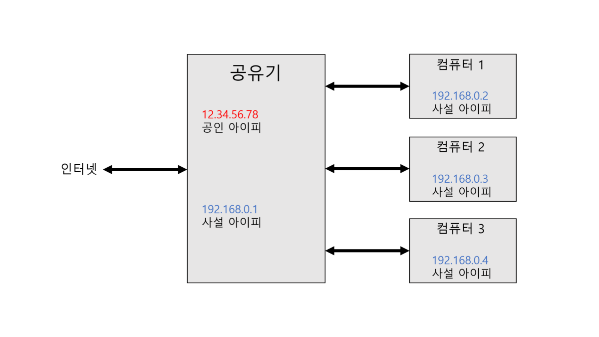 하나의 IP 주소와 포트 번호 결합의 통신 요청을 다른 곳으로 넘겨주는 네트워크 주소 변환의 응용- 공유기 <-> 사설 네트워크 - 인터넷 사용을 위해서 고유한 IP 주소 필요 (공인 IP) - 네트워크가 딱히 필요하지 않은 장비들에 대해서는 별도의 사설 네트워크 구축함 - 10.x.x.x, 172.16~31.x.x, 192.168.x.x 대역 - 공유기가 사설 IP 딱 대줘 -