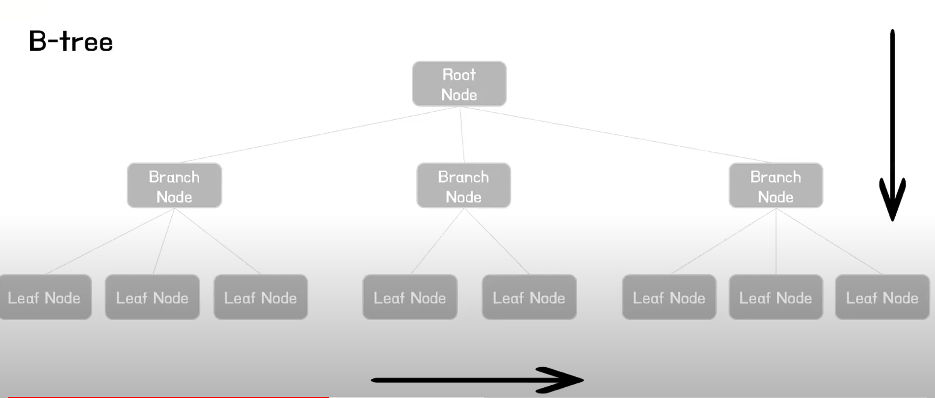 - 수직적 탐색, 수평적 탐색 - 수직적으로 조건 알맞는 Branch Node 찾고 - 수평적으로 조건 알맞는 Leaf Node 찾기