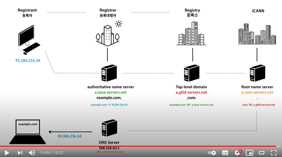 - DNS로 부터 순차적으로 NameServer-Registry-Registrar 조회하고 Registrar 등록 대행자에서 ip 주소와 도메인 정보를 가져옴
