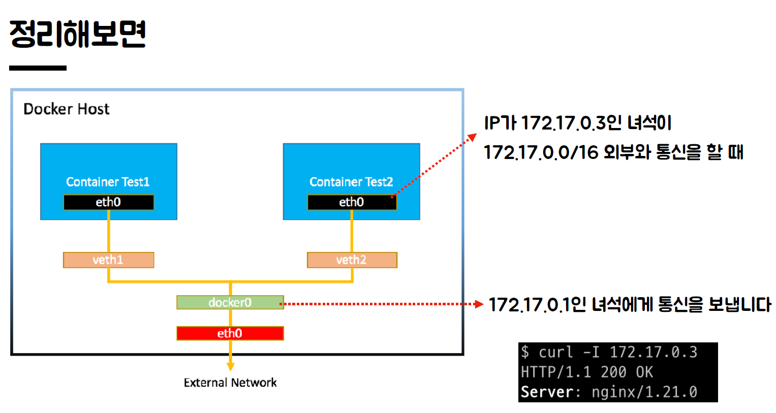 - docker0를 통해 다른 컨테이너에게 통신을 보내게 됨