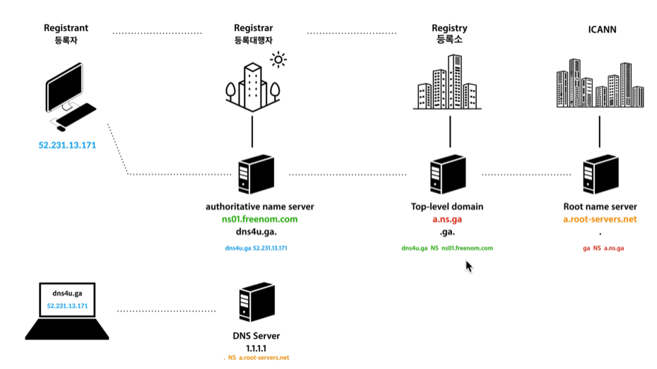 - Registry: .com, .net 등 탑 레벨 도메인 관리