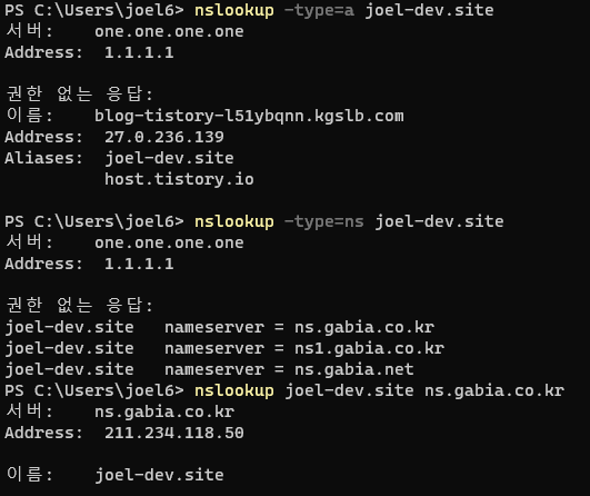 - joel-dev.site의 A 레코드를 조회 (타입 안쓰면 이게 디폴트)