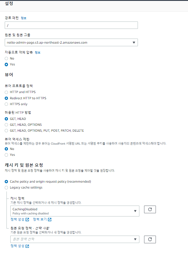 cloudfront 동작 추가 - 경로패턴 "/" 으로 가도록 경로 추가 - 뷰어 프로토콜 정책은 ssl 인증서 추가할거니까 redirect http to https로 설정! -