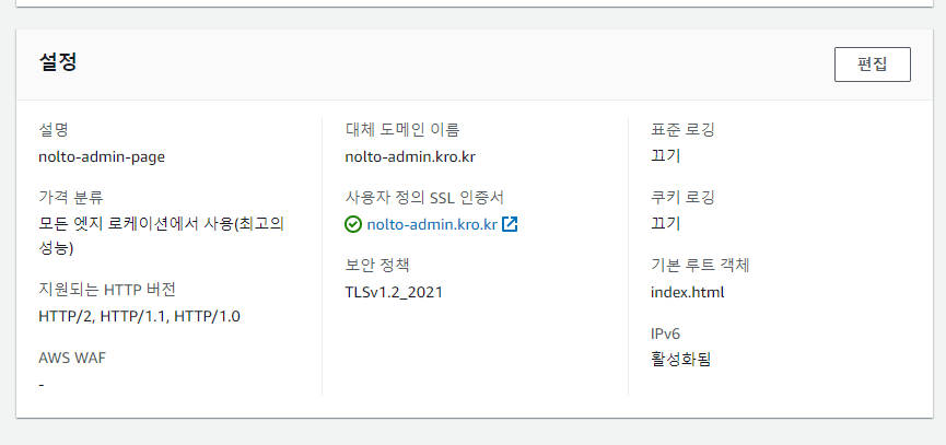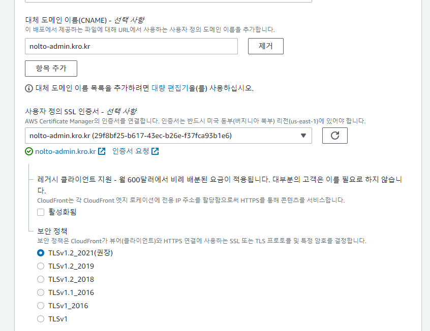 cloudfront 설정을 조금 더 자세히 들여다보면,,, - CNAME으로 별명 도메인 하나 등록해주고 - ssl 인증서 발급 받은 것을 등록해주자 -