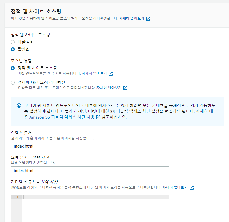 s3 속성 들어가서 정적 웹사이트 호스팅 편집 클릭 -