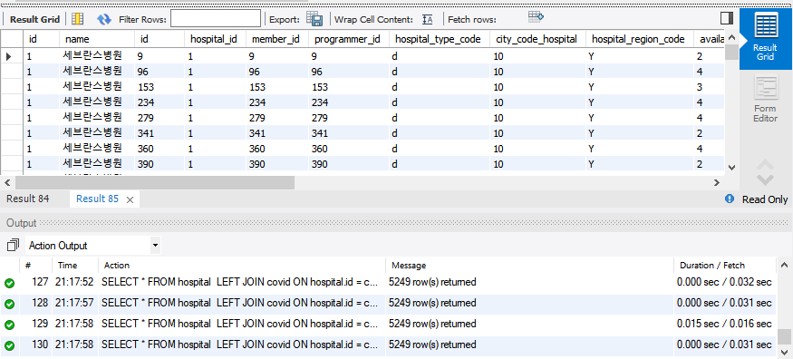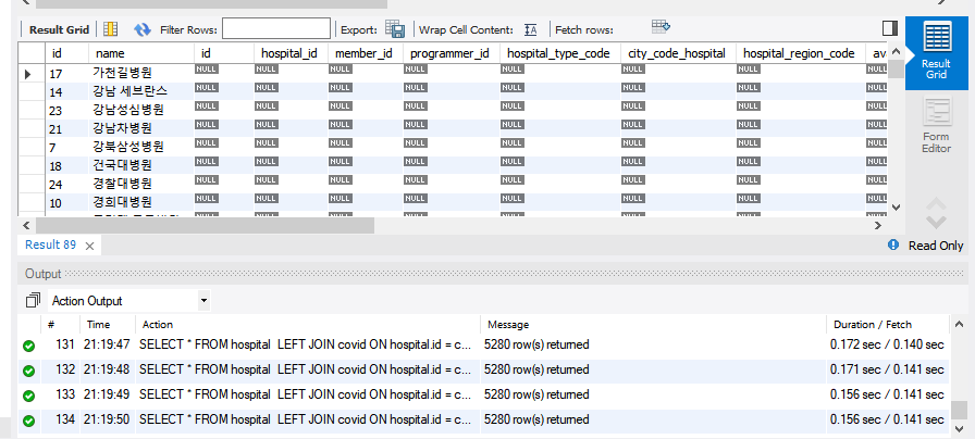 -  - 테이블의 왼쪽 id, name이 hospital의 테이블, 그 뒤가 covid 테이블 - hospital_id 가 1인 레코드들이 where절에서 필터링되어 결과값으로 보여준다 (총 5249 row 반환) ```SQL SELECT * FROM hospital LEFT JOIN covid ON hospital.id = covid.hospital_id AND hospital.id = 1; ``` -  - hospital을 기반으로 left join을 진행한다. - hospital의 해당 id가 hospital.id = 1이 아닌 hospital 튜플들은 covid 테이블이 null인 튜플들로 join된다. (총 hospital.id=1 인 5249 row + hospital.id=1아닌 31 row 반환)- 왜 이러지...?