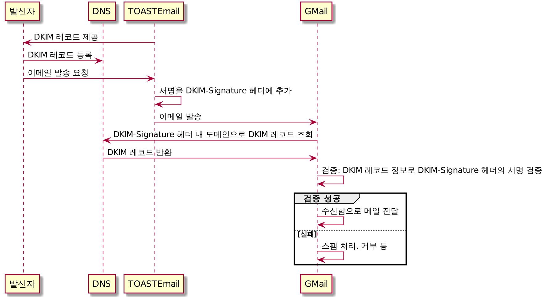 - 발신자가 발신 메시지에 암호로 서명하고, 다른 확인 메타데이터와 함께 DKIM-Signature에 포함시켜 전송