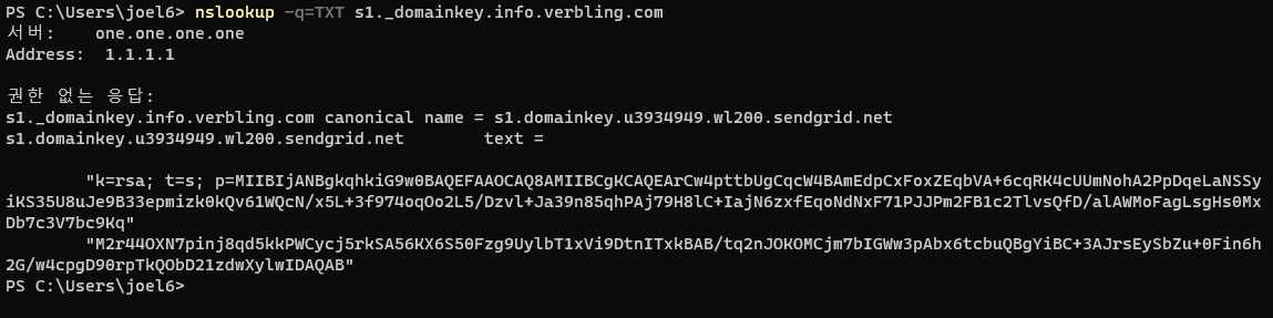DKIM-Signature: v=1; a=rsa-sha256; c=relaxed/relaxed; d=info.verbling.com; h=content-type:from:mime-version:subject:reply-to:x-feedback-id:to; s=s1; bh=yurMcrg5W97a0bnM840AyZYyEnx4j8QZcGCRwB4r6eM=; b=qEiTpG63wwKCYlEPQ05DfLtq5OzIgvT5qgKwhqn0h6IN/3khkA7pfD5C33a9phS+MBTH cGIUgYoeUBeFHB1xluq/zxi9D/qyxfznfl++2GsJY5FK6emKhrCPpuMBCrjFyspyuMfClZ EFqT33dTpty4jKzhbe2YMJUfFKfP1AZ8ENQN/+GvjDufjguwBUJ0PhEZrH8NCnsheszPw9 gu9Sb5abx5WsCbvoUBJtDaXgwyLDpAwwgK6H6NgPw1Zt96a531KjM7053omFk2zu872lnG uk74LtvEc5MUglVqbvHevFk74CUsxHUCaoTlKNq14UQCtVdZ3jT/R2NQwbQ3nZeg==- DKIM 서명 메시지를 수신하면 다음 DNS 쿼리를 구성해 공개키 조회 - selector._domainkey.cstoday.me - 버블링 예시: s1._domainkey.info.verbling.com -