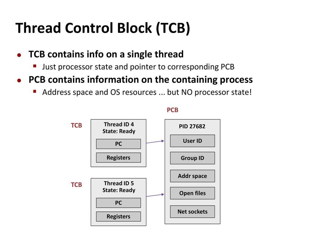 - TCB: 쓰레드 별로 존재하는 자료구조. PC/Register/PCB를 가리키는 포인터!!