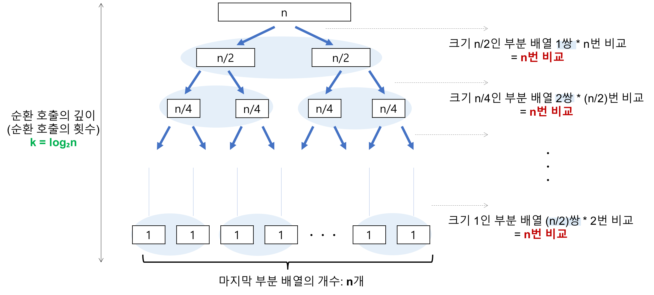 퀵 정렬은 평균적으로 O(nlog₂n) 의 시간 복잡도를 가져요. 배열을 순회하며 n번 비교하지만, 그 과정이 배열을 절반으로 분할함에 따라 log₂n번만 필요한 것이죠. 그림으로 보면 다음과 같아요.