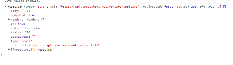 <body> <div id="a"></div> <input type = "button" value="fetch" onclick="connectServer()"> </body> <script> var div = document.getElementById("a"); function connectServer() { fetch("https://api.cryptohows.xyz/venture-capitals") .then((response) => response.json()) .then((data) => { for(let i=0; i<data.length; i++) { drawInfo(data[i]); } }); } function drawInfo(data) { var id = document.createElement('h5'); id.textContent = data.id; div.append(id); var name = document.createElement('h5'); name.textContent = data.name; div.append(name); var about = document.createElement('h5'); about.textContent = data.about; div.append(about); var newLine = document.createElement('hr'); div.append(newLine); } </script>