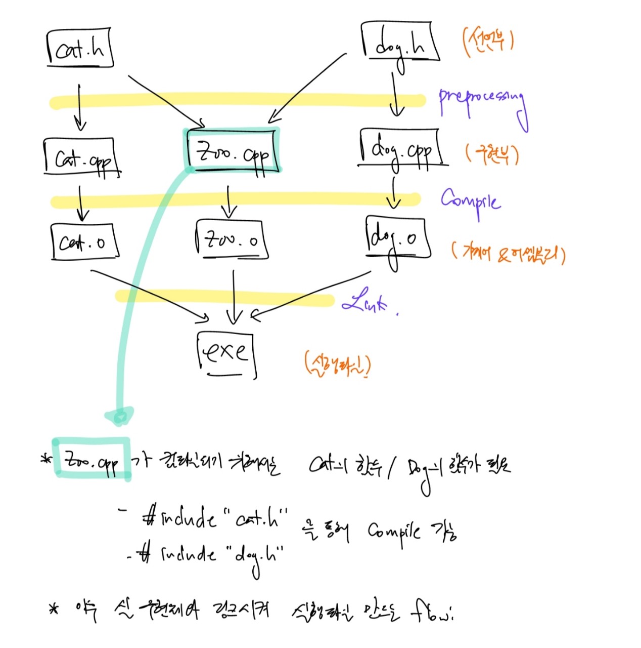- 헤더 파일은 컴파일러에게 헤더파일에 있는 클래스/함수는 있는 것이니, 굳이 해당 클래스/함수를 찾으려고 전체 프로젝트를 뒤지지 말고 뚝딱 컴파일하라고 알려주는 용도