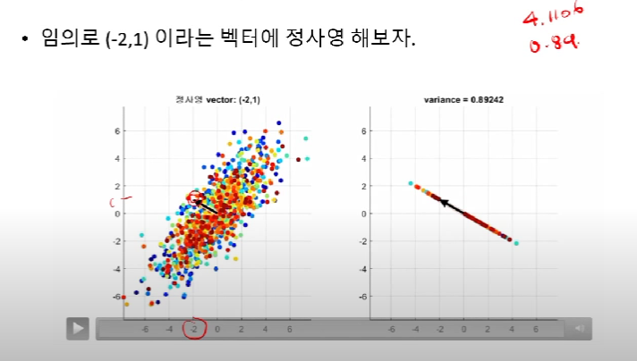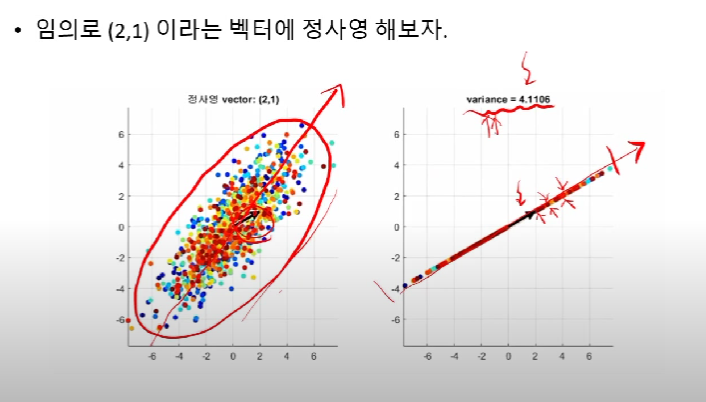 - 특정 벡터에 정사영을 시켰을 떄 Variance가 클수록 분포를 잘살린 것으로 간주