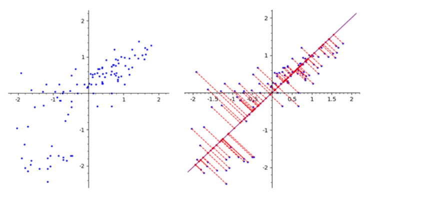 - 주어진 2차원 데이터를 첫 번째 축을 찾아 정사영한 그림
