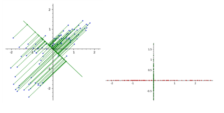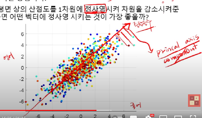 - 2차원 평면 상의 산점도를 1차원의 Principal Axis Componenet(주축) 정사영시켜 차원 감소 가능!