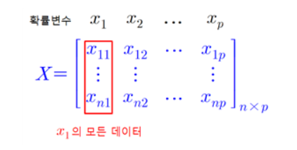 - X의 각 열의 평균 구함. 확률변수 xj의 평균은 xj~로 표기