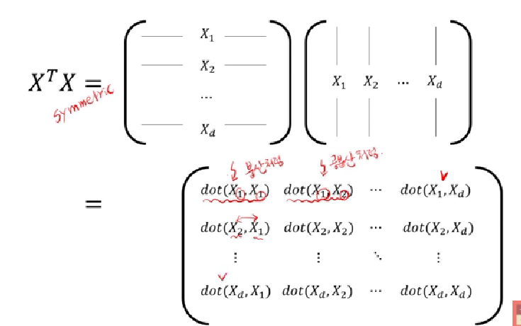 - 각 열별로 데이터에서 열의 평균을 뺌 => 이를 행렬 X~라고 지칭