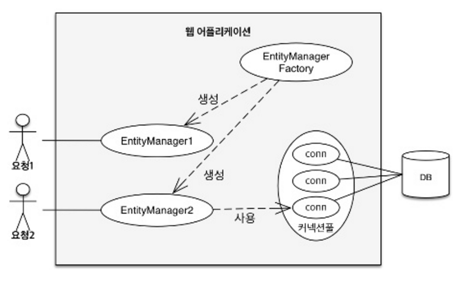 - 어플리케이션 시작 => EntityManagerFactory 초기화 => 필요한 상황에 EntityManager 생성하여 사용