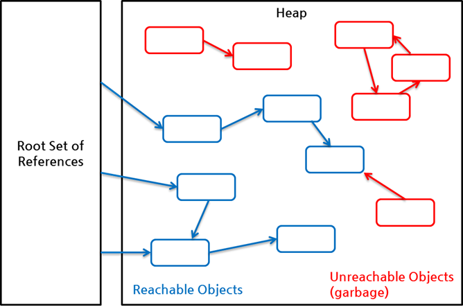 - unreachable: root set으로 부터 시작되는 참조 사슬로 참조되지 않는 객체