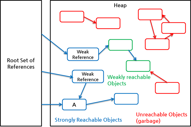 - weakly의 경우 root set으로 부터 시작된 참조 사슬에 포함되어도 회수됨
