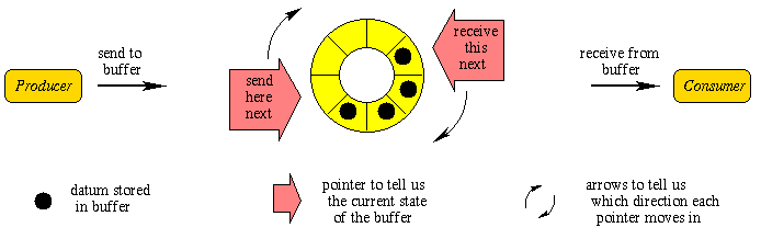 public class Main { public static void main(String[] args) { Table table = new Table(100); new ProducerThread(table).start(); new ConsumerThread(table).start(); } } public class ProducerThread extends Thread { private static int id = 0; Table table; public ProducerThread(Table table) { this.table = table; } public void run() { while(true) { Thread.sleep(1000); String packet = "No: " + nextId(); table.put(packet); // 큐에 추가하는 연산 } } private static synchronized int nextId() { return id++; } } public class ConsumerThread extends Thread { private final Table table; public ConsumerThread(Table table) { this.table = table; } public void run() { while(true) { String packet = table.take(); // 큐에서 가져옴 System.out.println("consumer: " + packet); } } } public class Table { private final String[] buffer; private int tail; private int head; private int count; public Table(int count) { this.buffer = new String[count]; this.head = 0; this.tail = 0; this.count = 0; } public synchronized void put(String packet) { while (count >= buffer.length) { wait(); } buffer[tail] = packet; tail = (tail + 1) % buffer.length; count++; notifyAll(); } public synchronized String take() { while (count <= 0) { wait(); } String packet = buffer[head]; head = (head + 1) % buffer.length; count--; notifyAll(); retunr packet; } }