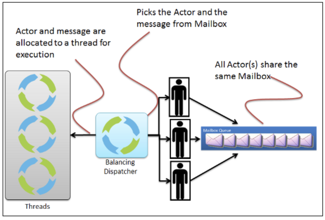 - 밸런싱 디스패처가 메일박스에서 메시지를, 액터를 고름