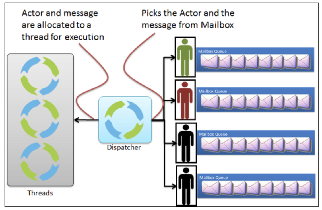 - 액터와 메시지가 쓰레드에 실행을 위해 할당됨