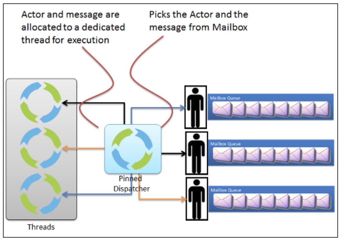 - 액터와 메시지가 지정된 쓰레드에 실행을 위해 각각 할당됨