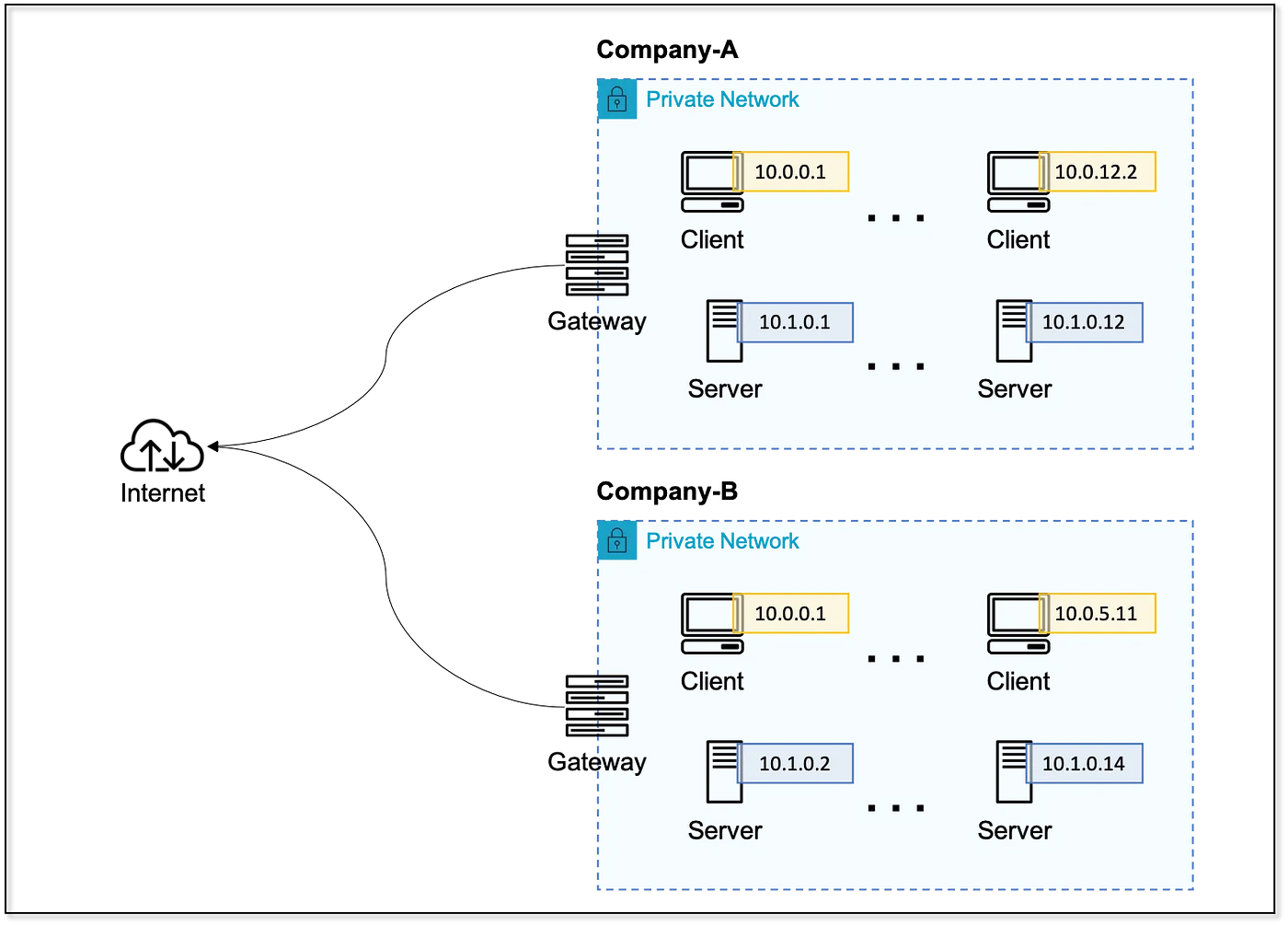 - 회사 바깥의 특정 클라이언트에 어떤 요청을 해도 사설 IP에는 도달하지 못함
