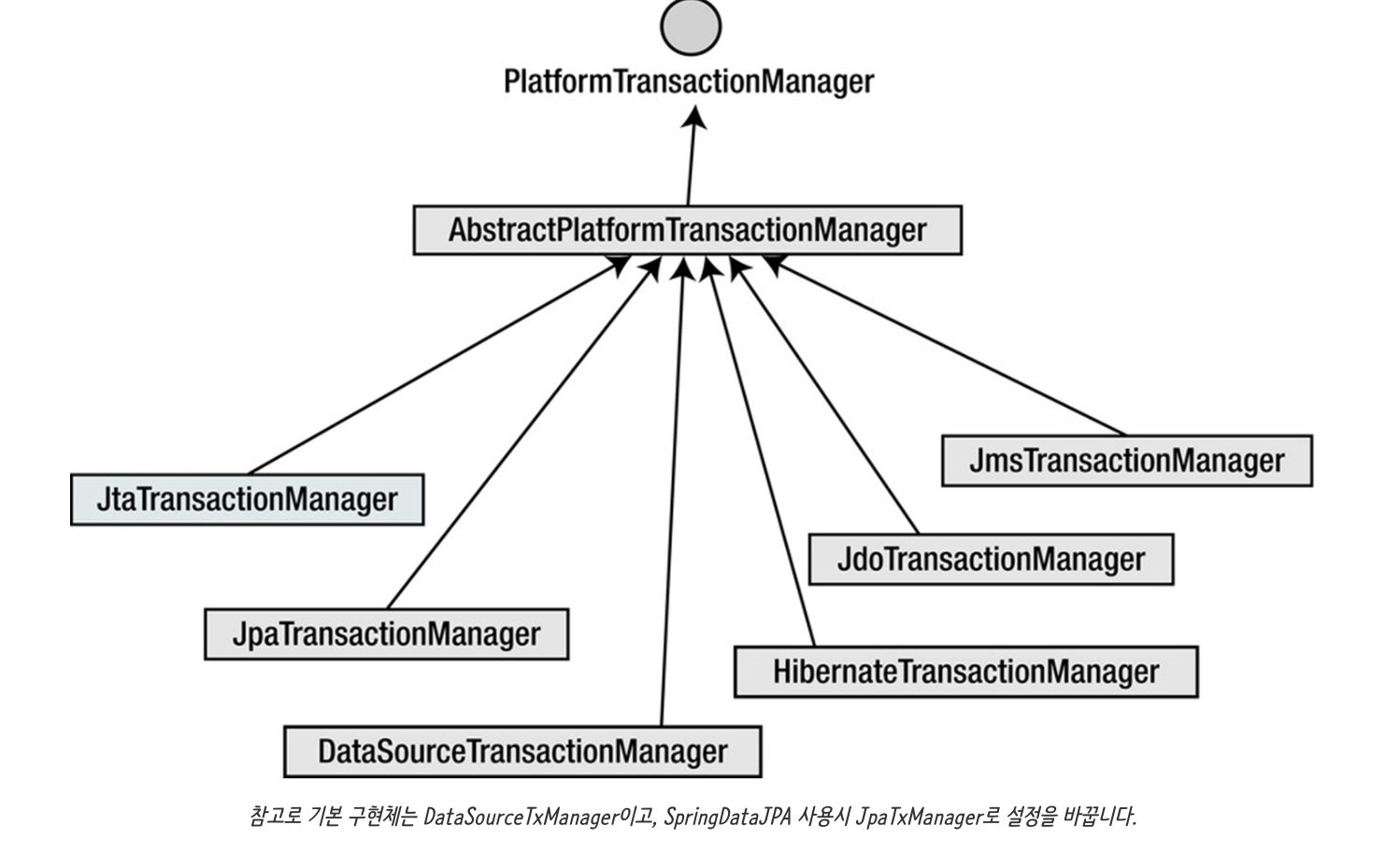 - 구현체는 갈아 끼울 수 있는 PlatformTransactionManager 주입되어 사용