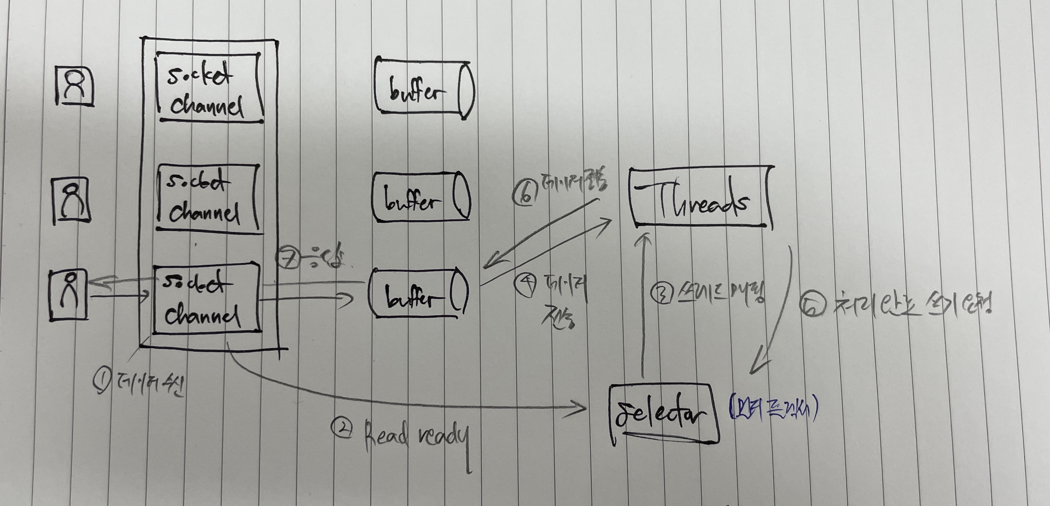 - 클라이언트 커넥션 요청, 데이터 읽기/쓰기 필요시 -> Channel이 Selector에 이벤트 통보