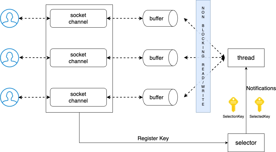 Selector: Socket이 변경되었으면 변경되었다고 이벤트를 만들어 알림을 주도록 함 -> 컴퓨팅 자원 효율적- linux에서 데이터 수신, 새 커넥션 등 소켓에 새 이벤트 확인을 위한 select, poll, epoll 등을 제공하는데 이를 활용